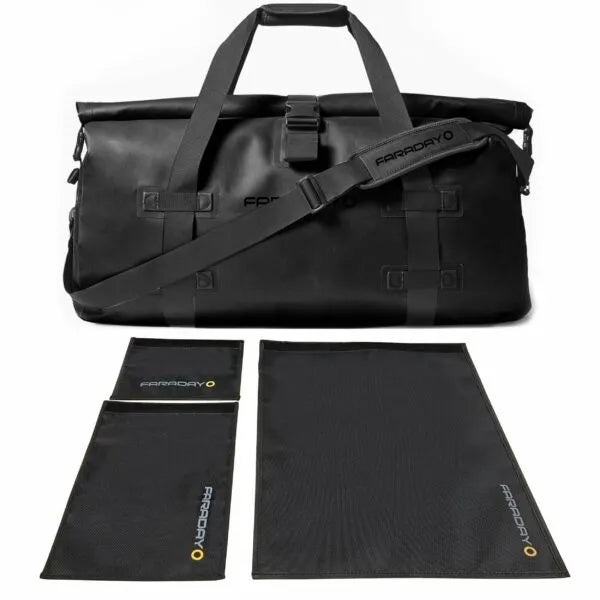 The JACKET Faraday Bag Duffel Kit keeps devices safe and secure by blocking Cell Signal, GPS, RFID, and WiFi, maintaining the devices’ integrity and preventing remote influences from accessing content. The JACKET offers >85 dB attenuation (400 MHz-4 GHz) metal-plated CYBER NC (Nickel/Copper) fabric lining and a durable nylon canvas exterior. With precision stitching and a secure Velcro closure, the JACKET is designed for performance and endurance. This kit includes: 1 – 4.5″ x 8″ JACKET Phone Faraday Bag, 1 – 7.5″ x 10″ JACKET XL Tablet Faraday Bag, 1 – 14″ x 16″ JACKET XXL Laptop Faraday Bag, and 1 – 24″ x 12″ x 12″ JACKET Faraday Duffel Bag XL. These bags are sized to fit all major cell phone makes and models, most external hard drives, tablets, and laptops. See other listings for additional variations and sizes of privacy bags